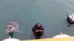 イルカもくじらも、ちゃんと餌貰えるのを知ってて、小魚入りの青いバケツ持って桟橋に行くと、ちゃんとついて来るの。