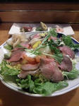 酢飯の上に地元産のしめじやレタス、水菜、トマトの角切り等の野菜と温泉卵、飛騨牛のローストビーフ&時雨煮をちらした物。